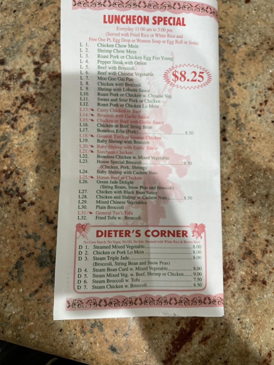 One of the standout features is the Luncheon Specials, including favorites like Chicken and Shrimp Chow Mein, all priced at just US$8.25. For those looking for healthier choices, the Dieter's Corner offers steamed vegetables and lo mein options at a similar price point.